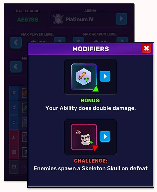 Friendly Battles can now have Modifiers! Much like our Weekly Tournaments, Friendly Battles now have the ability to mutate and evolve how you see fit. You can choose 1 Bonus and 1 Challenge Modifier at a time.